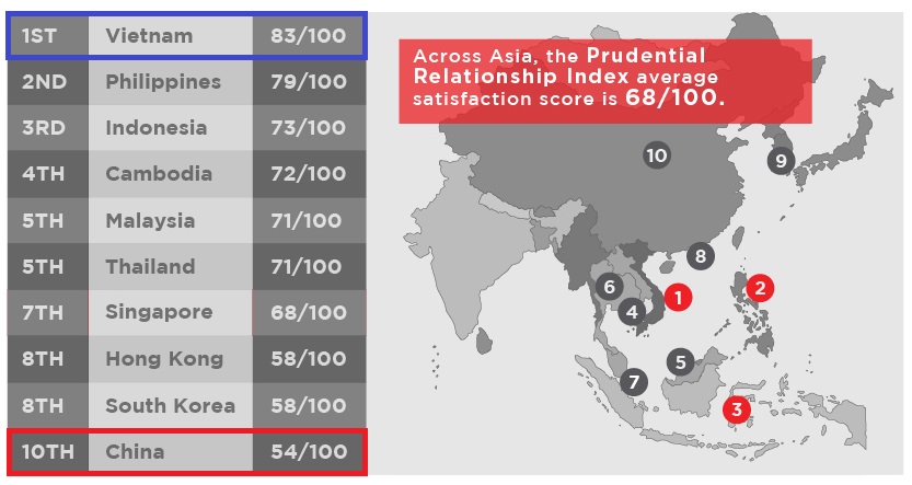 保誠保險(xiǎn)公布的2016年保誠人際關(guān)系指數(shù)顯示,亞洲人對(duì)人際關(guān)系的總體滿意度較高,為68%。亞洲十個(gè)國家和地區(qū)中,越南受訪者對(duì)人際關(guān)系的滿意度最高,為83分,其次分別是菲律賓和印度尼西亞。中國得分最低,僅54分。另外,人們最容易因金錢、孩子以及缺乏關(guān)注等問題產(chǎn)生爭(zhēng)執(zhí)。(美通社,2017年2月9日香港)
