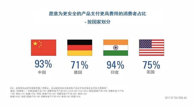 知名認證機構(gòu)TUV南德意志集團進行了一項全球性的獨立研究,選取了中國、德國、印度和美國這四個國家的數(shù)個一線城市作為樣本,寫成《TUV南德意志集團消費品安全報告》。報告顯示,中國消費者對產(chǎn)品安全的關(guān)注程度不斷提升。在被調(diào)查的中國消費者中有63%的人表示,產(chǎn)品安全現(xiàn)在對他們來說非常重要,而且在2007年,這一比例僅為53%。中國企業(yè)對產(chǎn)品的安全意識也在四個受訪國中排名第一,從2012年的72%上升至年93%,其次分別是德國(201680%),印度(62%)及美國(62%)。在中國,愿意為產(chǎn)品支付更高價格的消費者的比例達到了93%,遠超美國的75%和德國的71%。嬰童產(chǎn)品為消費者愿意“花高價,買安全”的產(chǎn)品。(美通社,2017年5月8日上海)