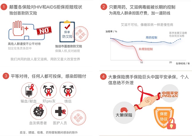 在第三十四個艾滋病燭光紀念日來臨之際,大象保險攜手中國平安財產保險股份有限公司推出了一款名為“防艾險”的新險種。大象保險相關負責人介紹:“‘防艾險’是國內保險業(yè)第一款也是目前唯一一款針對易感染人群的艾滋病感染專項保障險種。”“防艾險”顛覆了各保險公司對HIV和AIDS拒保拒賠的現(xiàn)狀。承保后,采用確診即賠付的方式。艾滋病是一種危害性極大的傳染病,潛伏時間長、治療方法復雜、治療周期也很長。雖然國家的醫(yī)保政策使部分患者解決了一些費用問題,但是由于報銷比例和用藥限制等因素,還是給很多家庭造成了極大的負擔。(美通社,2017年5月17日北京)