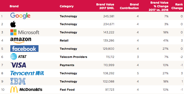 WPP和凱度華通明略今日發(fā)布了“2017年BrandZ最具價(jià)值全球品牌100強(qiáng)”排名,結(jié)果顯示,品牌價(jià)值位居前五的均為科技巨頭,分別為谷歌、蘋(píng)果、微軟、亞馬遜和Facebook 。其中,亞馬遜在所有100強(qiáng)品牌中實(shí)現(xiàn)了最高的價(jià)值增長(zhǎng),品牌價(jià)值增長(zhǎng)了403億美元(增長(zhǎng)41%),達(dá)到1393億美元,排名上升至第四位。今年在排行榜上頗為矚目的還有騰訊(排名第八),其社交平臺(tái)微信的用戶量持續(xù)上升,品牌價(jià)值增長(zhǎng)了27%,達(dá)到1083億美元,排名首次進(jìn)入前十。