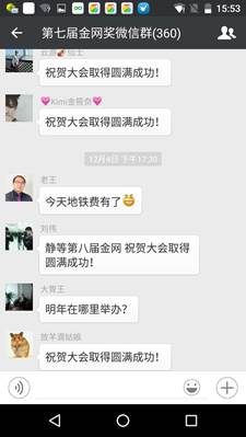 本屆金網獎一大亮點是建立了參會嘉賓微信群,群成員一度接近500人。通過微信群,會前發布了會議預熱及議程預告,會中觀眾實現了即時互動,共同熱烈地討論和消化嘉賓的演講干貨,會后大家繼續保持著對網絡營銷話題的交流。