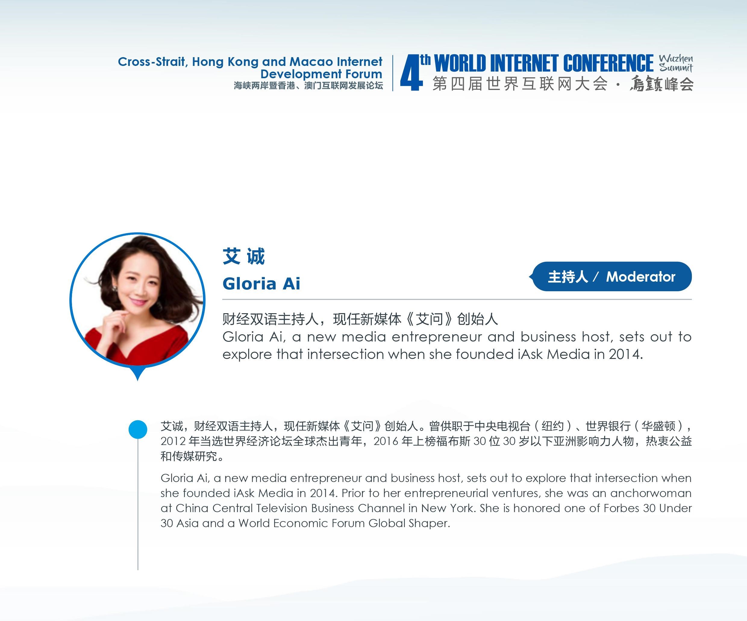 峰會將尋找海峽兩岸與香港、澳門互聯網發展最大公約數,搭建互聯網交流合作平臺。峰會主持人的特別邀請了來自內地、香港、臺灣三個地區的優秀主持人作為區域代表進行議題主持。本次論壇由祁小夏(國家互聯網信息辦公室港澳臺工作局局長)、盧秀芳(中天亞洲臺新聞總監)、路一鳴(中央電視臺主持人)、艾誠(財經雙語主持人,《艾問人物》創始人)共同完成《海峽兩岸暨香港、澳門互聯網發展論壇》的主持工作。在兩岸三地優秀主持人的精彩主持下,這場世界互聯網大會將會閃耀全球。