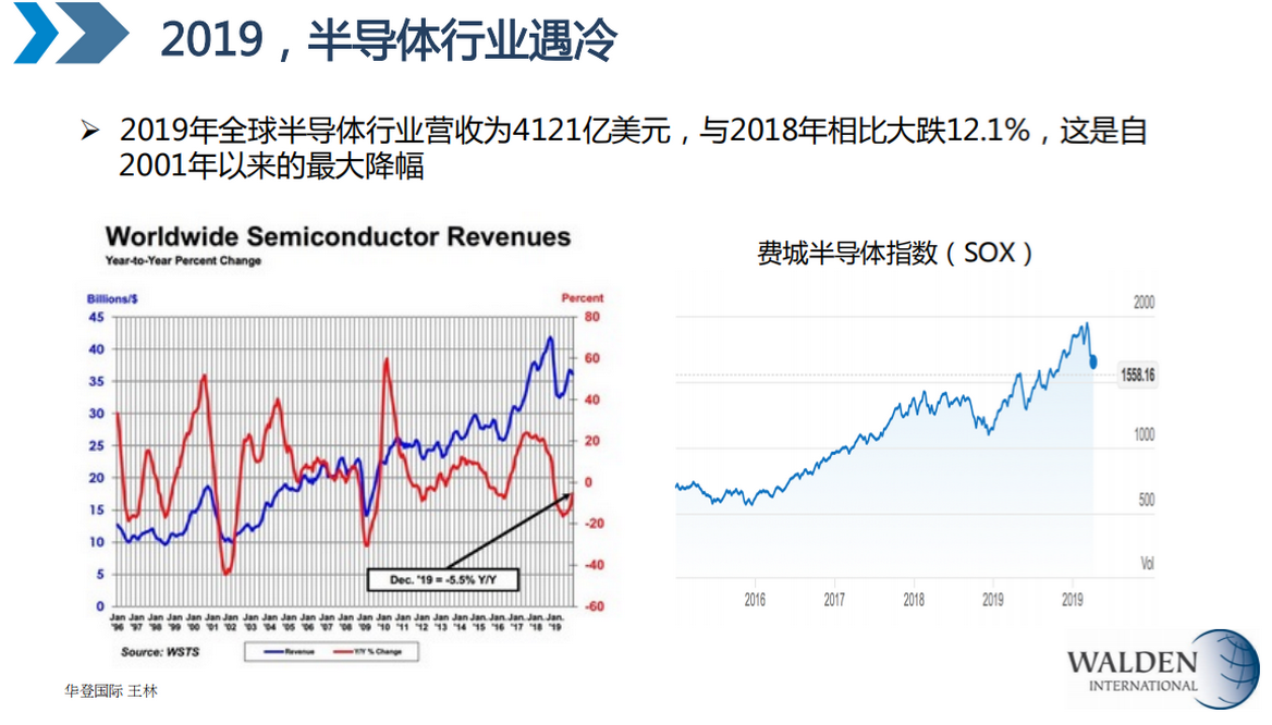 王林介紹,從2019年開始,半導(dǎo)體行業(yè)就進(jìn)入了一種疲軟狀態(tài)。統(tǒng)計(jì)數(shù)據(jù)顯示,受整個(gè)行業(yè)周期性下滑的影響,2019年全球半導(dǎo)體行業(yè)營收為4121億美元,與2018年相比大跌12.1%,創(chuàng)下了2001年以來的最大降幅。同時(shí)2020年開年,受疫情影響,Gartner再度下調(diào)對2020半導(dǎo)體產(chǎn)業(yè)營收的預(yù)期,調(diào)低了108億美元。