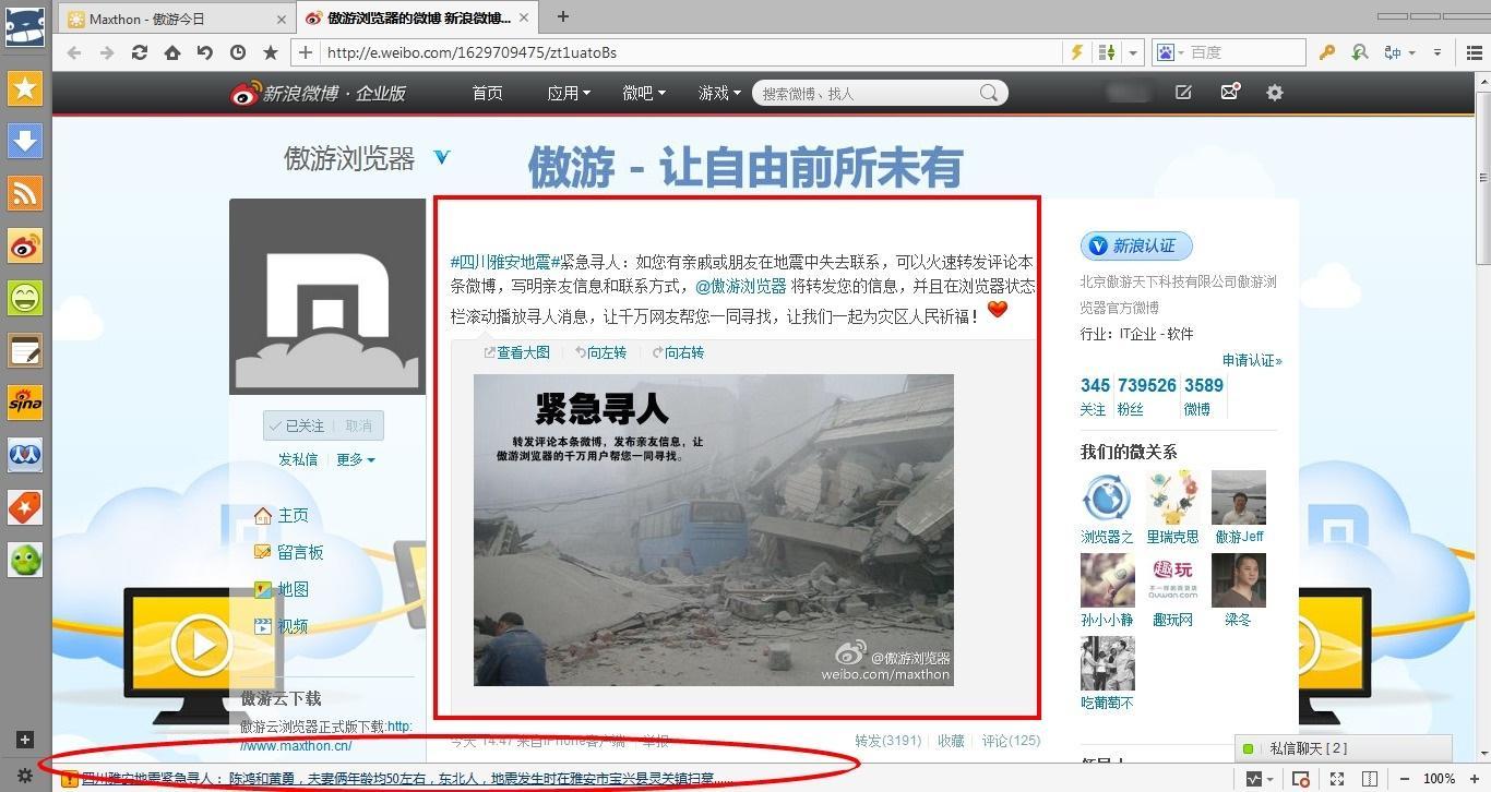 同時(shí),傲游還及時(shí)推出“雅安地震尋人”的微博公益活動(dòng),災(zāi)區(qū)群眾可以關(guān)注傲游云瀏覽器新浪官方微博,通過(guò)回復(fù),進(jìn)行人工求助和尋找親人等。關(guān)心災(zāi)區(qū)傲游用戶,還可以通過(guò)關(guān)注傲游云瀏覽器的官方微博了解更多災(zāi)區(qū)情況。