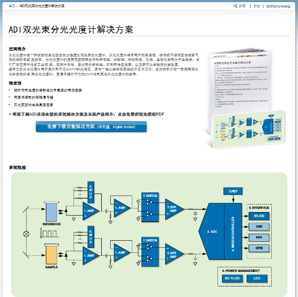 ADI推出的雙光束分光光度計解決方案是一款采用簡化光學(xué)系統(tǒng)的通用分光光度計,用于測量溶液、透明或不透明固體或者氣體的透射率或反射率,在物理、材料科學(xué)、化學(xué)和分子生物學(xué)等科研領(lǐng)域以及半導(dǎo)體、激光和光學(xué)制造等工業(yè)領(lǐng)域有著廣泛的應(yīng)用。在分光光度計的設(shè)計中,隨時間和溫度的漂移是非常重要的考慮因素,這就需要低漂移的精確信號鏈和精巧的雙光束架構(gòu)設(shè)計。針對這一方案,ADI提供了門類齊全的包括放大器,模數(shù)轉(zhuǎn)換器,微控制器,基準(zhǔn)電壓源,多路復(fù)用器和電源管理器件在內(nèi)的高性能產(chǎn)品組合,并以此構(gòu)建了雙通道色度計演示系統(tǒng)。與該解決方案配套提供的包括參考電路,應(yīng)用筆記和設(shè)計工具在內(nèi)的一系列設(shè)計資源亦為用戶提供了進(jìn)一步的設(shè)計便利。